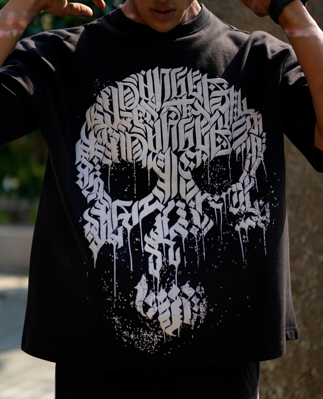 Elevate your streetwear look with this oversized black T-shirt featuring a bold calligraphy-style skull graphic. Designed for comfort and style, it’s perfect for everyday urban fashion.