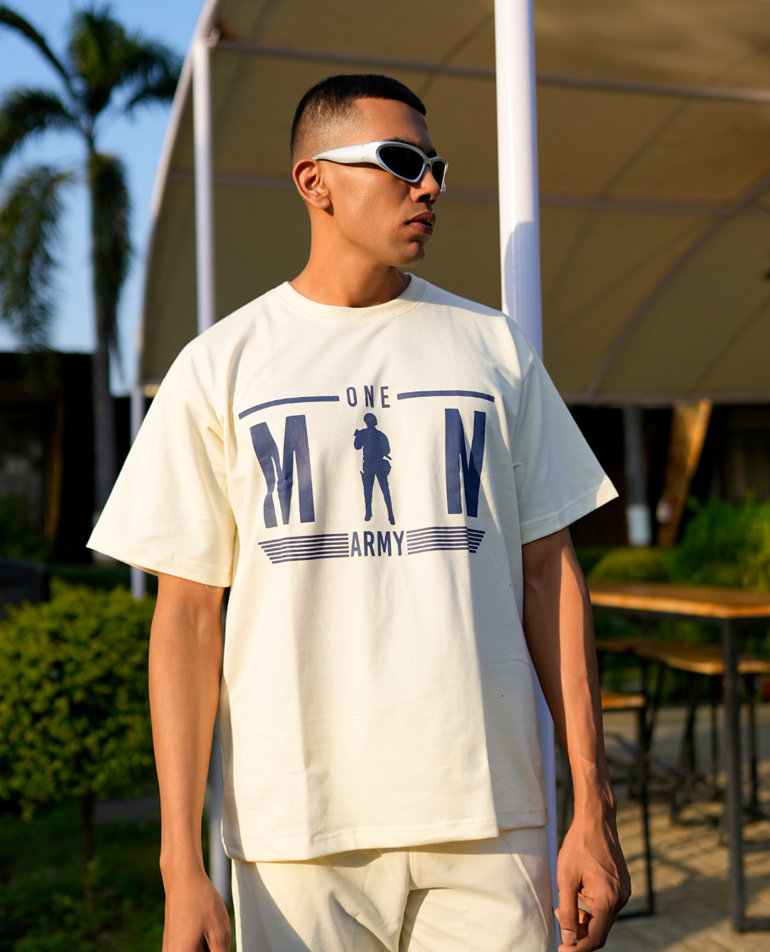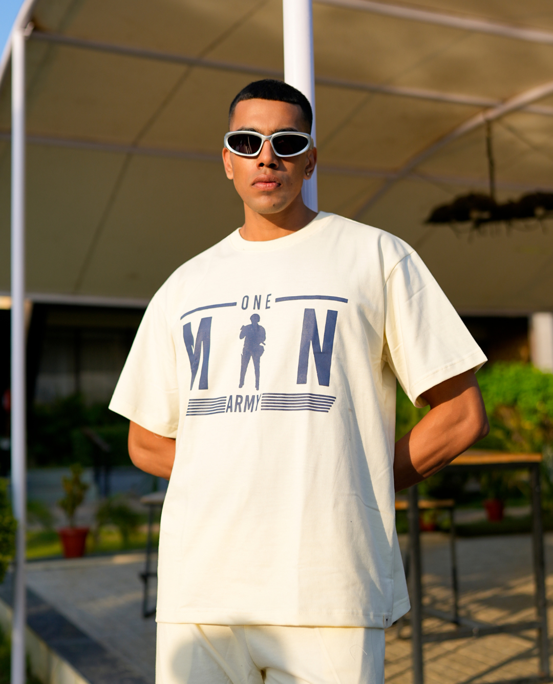 Step up your streetwear game with this cream white “One Man Army” oversized T-shirt, designed for comfort, confidence, and everyday style. Featuring a bold front graphic with military-inspired typography, this tee blends minimal aesthetics with strong visual appeal. Made from soft, breathable cotton, it offers a relaxed fit that’s perfect for outdoor wear, casual outings, or laid-back weekends.